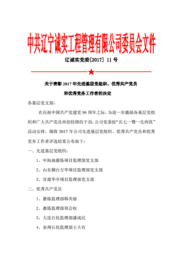 為慶祝中國共產(chǎn)黨建黨96周年,公司黨委于2017年6月30日下午在公司一樓會議室召開了慶祝建黨96周年暨“一優(yōu)兩先”表彰視頻大會。公司機關、撫順各項目監(jiān)理部及在撫的黨員同志在主會場參加了大會,中海油惠州項目監(jiān)理部黨支部、甘肅華亭項目監(jiān)理部黨支部、寧夏石化項目監(jiān)理部黨支部、中化泉州項目監(jiān)理部黨支部、廣西石化項目監(jiān)理部黨支部、蘭州石化項目監(jiān)理部黨支部、內(nèi)蒙古君正項目監(jiān)理部黨支部、神華寧煤項目監(jiān)理部黨支部、煙臺萬華項目監(jiān)理部黨支部設立視頻分會場。黨委委員馬駿主持了視頻大會。首先,公司黨委副書記馮玉琢同志宣讀了“一優(yōu)兩先”表彰決定。接著,黨委書記孫學良結合公司實際做了慶祝建黨96周年的講話。最后全體黨員重溫的入黨誓詞,進行入黨宣誓。