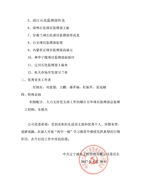 為慶祝中國共產(chǎn)黨建黨96周年,公司黨委于2017年6月30日下午在公司一樓會議室召開了慶祝建黨96周年暨“一優(yōu)兩先”表彰視頻大會。公司機(jī)關(guān)、撫順各項(xiàng)目監(jiān)理部及在撫的黨員同志在主會場參加了大會,中海油惠州項(xiàng)目監(jiān)理部黨支部、甘肅華亭項(xiàng)目監(jiān)理部黨支部、寧夏石化項(xiàng)目監(jiān)理部黨支部、中化泉州項(xiàng)目監(jiān)理部黨支部、廣西石化項(xiàng)目監(jiān)理部黨支部、蘭州石化項(xiàng)目監(jiān)理部黨支部、內(nèi)蒙古君正項(xiàng)目監(jiān)理部黨支部、神華寧煤項(xiàng)目監(jiān)理部黨支部、煙臺萬華項(xiàng)目監(jiān)理部黨支部設(shè)立視頻分會場。黨委委員馬駿主持了視頻大會。首先,公司黨委副書記馮玉琢同志宣讀了“一優(yōu)兩先”表彰決定。接著,黨委書記孫學(xué)良結(jié)合公司實(shí)際做了慶祝建黨96周年的講話。最后全體黨員重溫的入黨誓詞,進(jìn)行入黨宣誓。