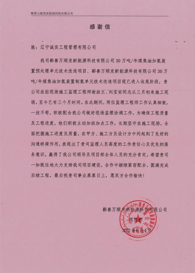 6月6日,公司新疆鄯善項(xiàng)目部收到業(yè)主單位的表揚(yáng)信。信中,業(yè)主言真意切地對我公司監(jiān)理人員在項(xiàng)目開展期間勤勉盡責(zé)的工作精神給予了高度的贊譽(yù)和充分的認(rèn)可。業(yè)主的表揚(yáng)是對公司綜合實(shí)力、服務(wù)質(zhì)量、技術(shù)水平的又一次肯定,誠實(shí)人必將以此為動力,在嚴(yán)守安全底線、嚴(yán)把工程質(zhì)量大關(guān)的道路上砥礪前行!