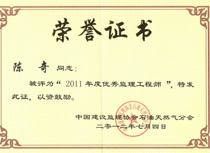 陳奇同志被中國建設監(jiān)理協(xié)會評為年度優(yōu)秀監(jiān)理工程師