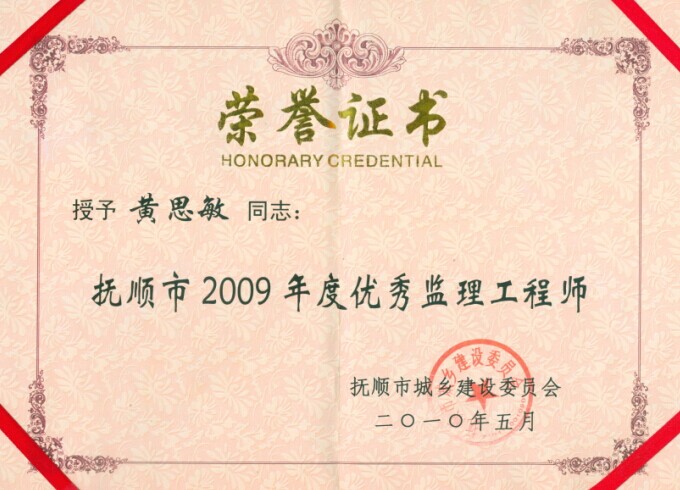 黃思敏同志被評(píng)為撫順市年度優(yōu)秀監(jiān)理工程師