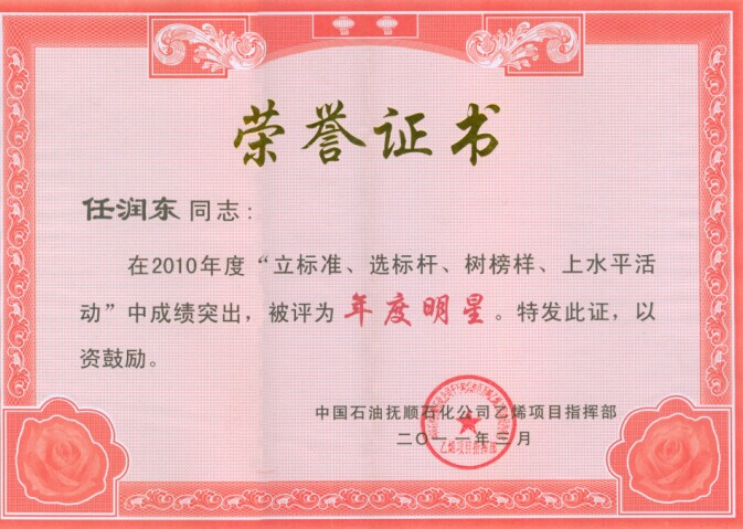 任潤東同志被中國石油撫順石化公司乙烯項(xiàng)目指揮部評為年度明星