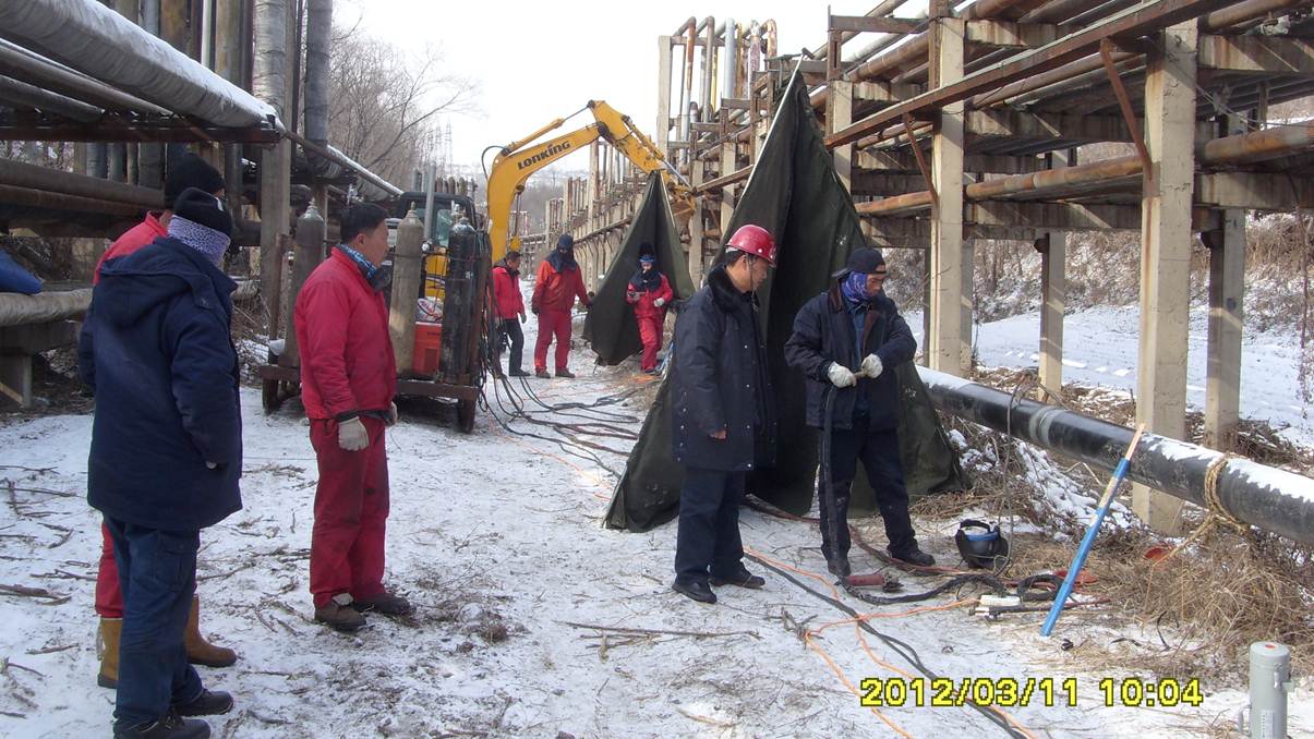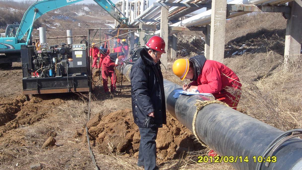 監(jiān)理人員檢查管線(xiàn)補(bǔ)口質(zhì)量