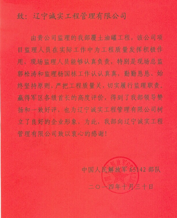 信中,中國人民解放軍65142部隊(duì)對(duì)我公司及項(xiàng)目監(jiān)理人員表示衷心的感謝。我公司項(xiàng)目監(jiān)理人員能夠認(rèn)真負(fù)責(zé)地工作,切實(shí)履行監(jiān)理職責(zé),并且對(duì)該項(xiàng)目的總監(jiān)理工程師郭松濤同志與工程師楊國棟同志提出了表揚(yáng)。為此軍區(qū)各級(jí)首長(zhǎng)給予了高度評(píng)價(jià),得到了65142部隊(duì)領(lǐng)導(dǎo)的贊揚(yáng)和一致好評(píng)!